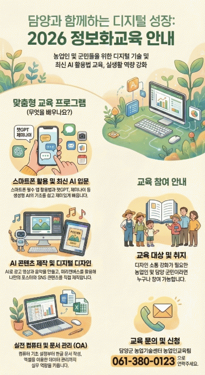 [¹Ìµð¾îÀü³² Á¦°¥´ëÁ¾ ±âÀÚ] ´ã¾ç±ºÀº Áö¿ª ³ó¾÷ÀÎÀÇ µðÁöÅÐ ¼ÒÅë ´É·ÂÀ» Ű¿ì°í ½º¸¶Æ®ÇÑ ³óÃÌ È¯°æÀ» Á¶¼ºÇϱâ À§ÇØ ¡®2026³â ³ó¾÷ÀÎ Á¤º¸È ±³À°¡¯À» ÃßÁøÇÑ´Ù. À̹ø ±³À°Àº 3¿ù 3ÀϺÎÅÍ 6¿ù 19ÀϱîÁö ÃÑ 7°³ °úÁ¤(68½Ã°£)À¸·Î ¿î¿µ¡¦