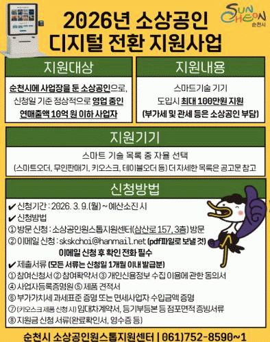 [¹Ìµð¾îÀü³² ÀÓ¼º¿Ï ±âÀÚ]¼øÃµ½Ã´Â ¿Â¶óÀÎ ÁÖ¹® È®´ë¿Í ºñ´ë¸é ¼Òºñ Áõ°¡ µî µðÁöÅРȯ°æ º¯È¿¡ ´ëÀÀÇØ Áö¿ª ¼Ò»ó°øÀÎÀÇ °æÀï·ÂÀ» ³ôÀ̱â À§ÇÑ ¡®2026³â ¼Ò»ó°øÀÎ µðÁöÅÐ Àüȯ Áö¿ø»ç¾÷¡¯À» º»°Ý ÃßÁøÇÑ´Ù. À̹ø »ç¾÷Àº Ű¿À½ºÅ©, ½º¸¶¡¦