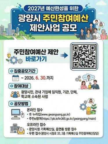 [¹Ìµð¾îÀü³² ÀÓ¼º¿Ï ±âÀÚ]±¤¾ç½Ã´Â ½Ã¹ÎÀÌ ¿¹»ê Æí¼º °úÁ¤¿¡ Á÷Á¢ Âü¿©ÇÒ ¼ö ÀÖµµ·Ï 6¿ù 30ÀϱîÁö ¡®2027³â ¿¹»ê ¹Ý¿µ ÁÖ¹ÎÂü¿©¿¹»ê Á¦¾È»ç¾÷¡¯À» ÁýÁß °ø¸ðÇÑ´Ù°í ¹àÇû´Ù. À̹ø °ø¸ð´Â ¿¹»ê °úÁ¤¿¡ ´Ù¾çÇÑ °èÃþÀÇ Âü¿©¸¦ È®´ëÇϰí, ½Ã¹Î¡¦