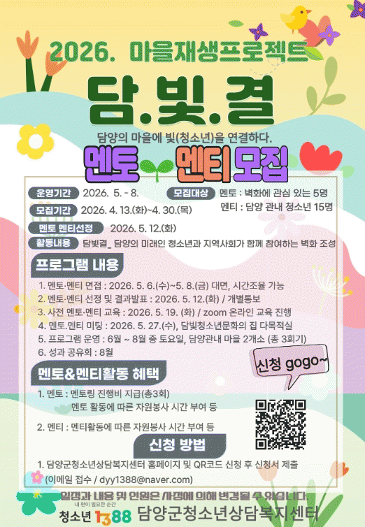 [¹Ìµð¾îÀü³² Á¦°¥´ëÁ¾ ±âÀÚ] ´ã¾ç±ºÃ»¼Ò³â»ó´ãº¹Áö¼¾ÅͰ¡ Áö¿ª û¼Ò³âÀÌ Á÷Á¢ Âü¿©ÇØ ¸¶À» ȯ°æÀ» °³¼±ÇÏ°í °øµ¿Ã¼ ÀǽÄÀ» ȸº¹ÇÏ´Â ¡®2026³â ¸¶À»Àç»ý»ç¾÷ ´ã¡¤ºû¡¤°á¡¯ÀÇ ¸àÅä¿Í ¸àƼ¸¦ ¿À´Â 30ÀϱîÁö ¸ðÁýÇÑ´Ù. ¡®´ã¡¤ºû¡¤°á¡¯Àº¡¦