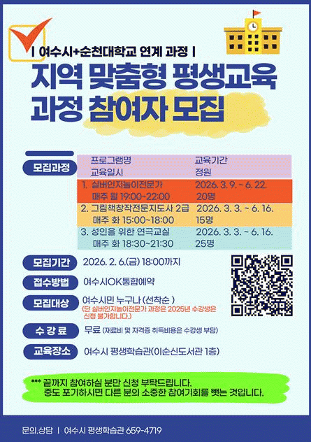 [¹Ìµð¾îÀü³² ÀüÇü¼º ±âÀÚ]¿©¼ö½Ã°¡ ±¹¸³¼øÃµ´ëÇб³¿Í °øµ¿À¸·Î ÃßÁøÇÏ´Â 'Áö¿ª ¸ÂÃãÇü Æò»ý±³À°°úÁ¤' Âü¿©ÀÚ¸¦ ¸ðÁýÇÑ´Ù. À̹ø »ç¾÷Àº ¿©¼ö½Ã¿Í ¼øÃµ´ëÇб³°¡ Çù·ÂÇÏ¿© Áö¿ª Ư¼º°ú ½Ã¹ÎÀÇ ÇнÀ ¼ö¿ä¸¦ ¹Ý¿µÇÑ ¸ÂÃãÇü Æò»ý±³À°À» ¿î¿µÇÔ¡¦