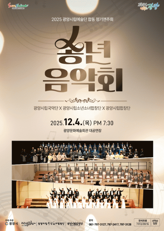 [¹Ìµð¾îÀü³² ÀÓ¼º¿Ï ±âÀÚ]±¤¾ç½Ã´Â ¿¬¸»À» ¸Â¾Æ ¿À´Â 12¿ù 4ÀÏ ¿ÀÈÄ 7½Ã 30ºÐ ±¤¾ç¹®È¿¹¼úȸ°ü ´ë°ø¿¬Àå¿¡¼ 2025³â ±¤¾ç½Ã¸³¿¹¼ú´Ü ÇÕµ¿ Á¤±â¿¬ÁÖȸ ¡®¼Û³âÀ½¾Çȸ¡¯¸¦ °³ÃÖÇÑ´Ù°í ¹àÇû´Ù. À̹ø °ø¿¬¿¡´Â ±¤¾ç½Ã¸³ÇÕâ´Ü, ½Ã¸³±¹¾Ç´Ü,¡¦