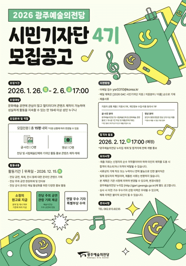 [¹Ìµð¾îÀü³² Á¦°¥´ëÁ¾ ±âÀÚ]±¤ÁÖ±¤¿ª½Ã ¿¹¼úÀÇÀü´çÀº Àü´çÀÇ ´Ù¾çÇÑ °ø¿¬ Á¤º¸¿Í ¹®È ¼Ò½ÄÀ» Á÷Á¢ ÃëÀçÇÏ°í °ø½Ä ¿Â¶óÀΠä³ÎÀ» ÅëÇØ ¾Ë¸± ¡®2026 ±¤ÁÖ¿¹¼úÀÇÀü´ç ½Ã¹Î±âÀÚ´Ü 4±â¡¯¸¦ 26ÀϺÎÅÍ 2¿ù6ÀϱîÁö ¸ðÁýÇÑ´Ù. ½Ã¹Î±âÀÚ´ÜÀº ¹®È¡¦