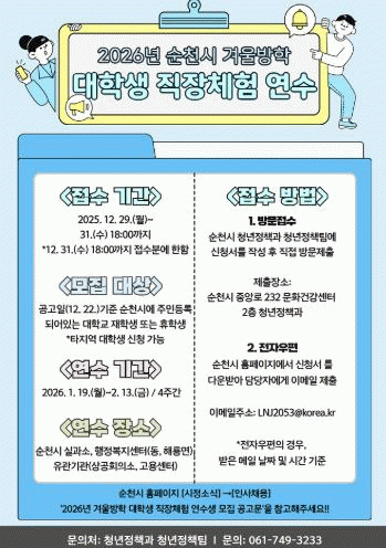 [¹Ìµð¾îÀü³² ÀÓ¼º¿Ï ±âÀÚ]¼øÃµ½Ã´Â °Ü¿ï¹æÇÐÀ» ¸Â¾Æ ´ëÇлýµé¿¡°Ô ÇàÁ¤ ÇöÀå °æÇèÀÇ ±âȸ¸¦ Á¦°øÇϱâ À§ÇØ ¡®2026³â °Ü¿ï¹æÇÐ ´ëÇлý Á÷ÀåüÇè ¿¬¼ö»ý¡¯À» ¸ðÁýÇÑ´Ù°í ¹àÇû´Ù. Á¢¼ö ±â°£Àº 12¿ù 29ÀϺÎÅÍ 31ÀϱîÁöÀ̸ç, ¼±¹ß ÀοøÀº ÃÑ ¡¦
