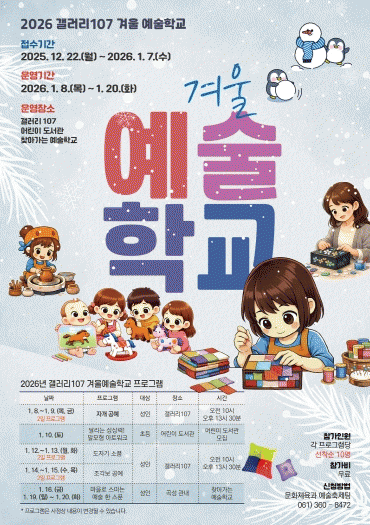 [¹Ìµð¾îÀü³² Á¦°¥´ëÁ¾ ±âÀÚ]Àü¶ó³²µµ °î¼º±ºÀÌ ¿î¿µÇÏ´Â °¶·¯¸® 107¿¡¼ ¿À´Â 12¿ù 22ÀϺÎÅÍ ³»³â 1¿ù 7ÀϱîÁö ¡®°Ü¿ï ¿¹¼úÇб³¡¯ ÇÁ·Î±×·¥ Âü°¡ÀÚ¸¦ ¸ðÁýÇÑ´Ù°í ¹àÇû´Ù. ¿¹¼úÇб³´Â ¸Å³â ¹æÇÐ ±â°£¿¡ ¿î¿µÇÏ´Â ¿¹¼ú±³À° ÇÁ·Î±×·¥À¸·Î ¡¦