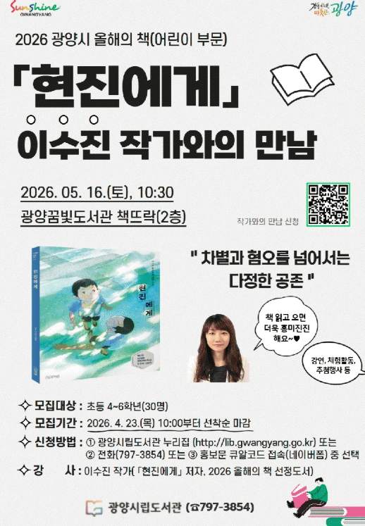 [¹Ìµð¾îÀü³² ÀÓ¼º¿Ï ±âÀÚ] ±¤¾ç½Ã´Â ¿À´Â 5¿ù 16ÀÏ ¿ÀÀü 10½Ã 30ºÐ ²Þºûµµ¼°ü¿¡¼ ¡®2026³â ¿ÃÇØÀÇ Ã¥¡¯ ¾î¸°ÀÌ ºÎ¹® ¼±Á¤ µµ¼'ÇöÁø¿¡°Ô'ÀÇ ÀúÀÚ À̼öÁø ÀÛ°¡¸¦ ÃÊÃ»ÇØ °¿¬À» ¿¬´Ù°í ¹àÇû´Ù. À̹ø °¿¬Àº ½Ã¸³µµ¼°üÀÌ ÃßÁøÇÏ´Â ¡®½Ã¡¦