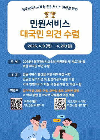 [¹Ìµð¾îÀü³² Á¦°¥´ëÁ¾ ±âÀÚ]±¤Áֽñ³À°Ã»Àº ¹Î¿ø¼ºñ½º ǰÁú Çâ»óÀ» À§ÇØ ¿À´Â 9~20ÀÏ ±¹¹Î±ÇÀÍÀ§¿øÈ¸ ¿Â¶óÀÎ Á¤Ã¥Âü¿© Ç÷§Æû ¡®±¹¹Î»ý°¢ÇÔ¡¯°ú ¡®½Ã±³À°Ã» ´©¸®Áý¡¯À» ÅëÇØ ´ë±¹¹Î ÀǰßÀ» ¼ö·ÅÇÑ´Ù. À̹ø ÀÇ°ß ¼ö·ÅÀº ±¹¹ÎÀÇ ´Ù¾çÇÑ ¸ñ¡¦