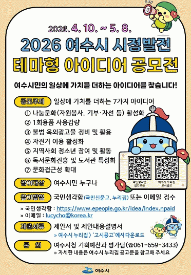 [¹Ìµð¾îÀü³² ÀüÇü¼º ±âÀÚ]¿©¼ö½Ã´Â ½Ã¹ÎµéÀÇ Âü½ÅÇϰí âÀÇÀûÀÎ ÀǰßÀ» Á¤Ã¥¿¡ ¹Ý¿µÇØ ¡®½Ã¹ÎÀÌ Âü¿©ÇÏ´Â ½ÃÁ¤¡¯À» ½ÇÇöÇϰíÀÚ ¿À´Â 4¿ù 10ÀϺÎÅÍ 5¿ù 8ÀϱîÁö ¡®2026³â ¿©¼ö½Ã ½ÃÁ¤¹ßÀü Å׸¶Çü ¾ÆÀ̵ð¾î °ø¸ðÀü¡¯À» ½Ç½ÃÇÑ´Ù°í ¹àÇû´Ù. ¡¦