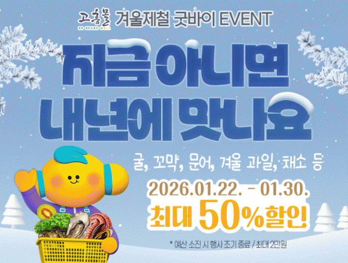 [¹Ìµð¾îÀü³² Á¦°¥´ëÁ¾ ±âÀÚ]°íÈﱺÀÌ ¿î¿µÇÏ´Â ¿Â¶óÀÎ ¼îÇθô °íÈï¸ôÀº 1¿ù 22ÀϺÎÅÍ 30ÀϱîÁö °Ü¿ï Á¦Ã¶ ³ó¼ö»ê¹°À» ÃÖ´ë 50% ÇÒÀÎÇϴ Ưº° ±âȹÀü ¡®Áö±Ý ¾Æ´Ï¸é ³»³â¿¡ ¸À³ª¿ä¡¯¸¦ °³ÃÖÇÑ´Ù. À̹ø ±âȹÀüÀº °Ü¿ïö¿¡ ¸À°ú ǰÁúÀÌ ¡¦
