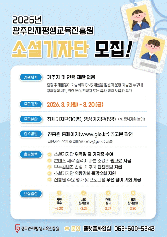 [¹Ìµð¾îÀü³² Á¦°¥´ëÁ¾ ±âÀÚ](Àç)±¤ÁÖÀÎÀçÆò»ý±³À°ÁøÈï¿øÀÌ ±¤ÁÖ °÷°÷ÀÇ »ý»ýÇÑ Æò»ýÇнÀ ÇöÀå ¼Ò½ÄÀ» ÀüÇÒ ¡®¼Ò¼È±âÀÚ´Ü¡¯À» ¿À´Â 3¿ù 20ÀϱîÁö ¸ðÁýÇÑ´Ù. À̹ø ¼Ò¼È±âÀÚ´ÜÀº ½Ã¹ÎÀÇ ½Ã°¢¿¡¼ Æò»ýÇнÀ ¹®È¸¦ È®»êÇϰí, º¯ÈÇÏ´Â ¹Ìµð¡¦