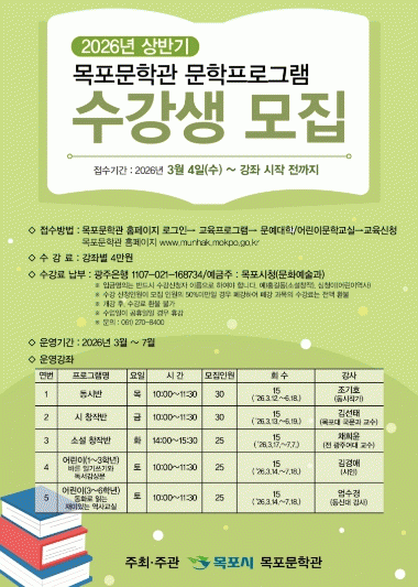 [¹Ìµð¾îÀü³² °í±Ô¼® ±âÀÚ]¸ñÆ÷¹®ÇаüÀº ½Ã¹ÎµéÀÇ ¹®È¿¹¼ú ÇâÀ¯ ±âȸ¸¦ ³ÐÈ÷°í Áö¿ª ¹®ÇÐ Àúº¯À» È®´ëÇϱâ À§ÇØ ¡®2026³â »ó¹Ý±â ±³À°ÇÁ·Î±×·¥¡¯ ¼ö°»ýÀ» ¸ðÁýÇÑ´Ù. À̹ø ÇÁ·Î±×·¥Àº 3¿ùºÎÅÍ 7¿ù±îÁö ¿î¿µµÇ¸ç, ¼ºÀÎ ´ë»ó ¹®¿¹´ëÇÐ 3°³¡¦