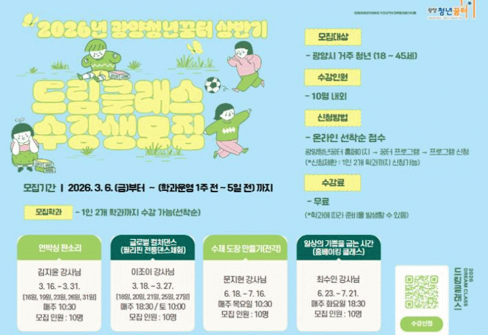 [¹Ìµð¾îÀü³² ÀÓ¼º¿Ï ±âÀÚ]±¤¾çû³â²ÞÅÍ´Â Áö¿ª û³âÀÌ Á÷Á¢ ±âȹÇÏ°í ¿î¿µÇϴ û³â ÁÖµµÇü ÇнÀ ÇÁ·Î±×·¥ ¡®2026³â »ó¹Ý±â µå¸²Å¬·¡½º¡¯ ¼ö°»ýÀ» ¸ðÁýÇÑ´Ù°í ¹àÇû´Ù. ¡®µå¸²Å¬·¡½º¡¯´Â û³âÀÌ °ÀÇ ±âȹ°ú ¿î¿µ¿¡ Á÷Á¢ Âü¿©ÇÏ´Â ±³À° ¡¦
