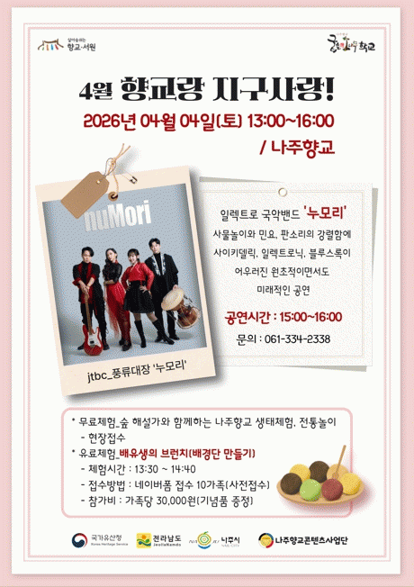 [¹Ìµð¾îÀü³² Á¦°¥´ëÁ¾ ±âÀÚ]Àü³² ³ªÁֽð¡ ÀüÅë¹®È¿Í È¯°æ ¸Þ½ÃÁö, Çö´ë °ø¿¬À» °áÇÕÇÑ Ã¼ÇèÇü ÇÁ·Î±×·¥À» ÅëÇØ ½Ã¹Î°ú °ü±¤°´¿¡°Ô »ö´Ù¸¥ ¹®È °æÇèÀ» Á¦°øÇÑ´Ù. 1ÀÏ ³ªÁֽÿ¡ µû¸£¸é ¡®³ªÁÖÇâ±³ ±ÁÀº ¼Ò³ª¹«Çб³¡¯ ÇÁ·Î±×·¥ÀÇ ÀÏȯÀ¸¡¦