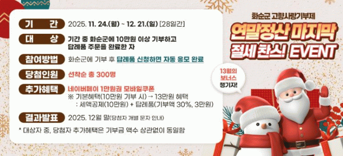 [¹Ìµð¾îÀü³² Á¦°¥´ëÁ¾ ±âÀÚ]ȼø±ºÀº ¿¬¸»À» ¸Â¾Æ °íÇâ»ç¶û±âºÎÁ¦ ¡®¿¬¸»Á¤»ê ¸¶Áö¸· Àý¼¼ Âù½º!¡¯ À̺¥Æ®¸¦ ¿À´Â 11¿ù 24ÀϺÎÅÍ 12¿ù 21ÀϱîÁö(28Àϰ£) ÁøÇàÇÑ´Ù°í ¹àÇû´Ù. À̹ø À̺¥Æ®´Â ¿¬¸»Á¤»ê ½ÃÁðÀ» ´ëºñÇØ °íÇâ»ç¶û±âºÎÁ¦ÀÇ ¼¼¡¦