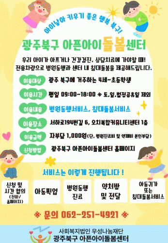 [¹Ìµð¾îÀü³² Á¦°¥´ëÁ¾ ±âÀÚ]±¤ÁÖ±¤¿ª½Ã ºÏ±¸ÀÇ Ã¹ ¹øÂ° °íÇâ»ç¶û±â±Ý ÁöÁ¤ ±âºÎ»ç¾÷ÀÌ °á½ÇÀ» ¸Î¾î ¾ÆÀÌ Å°¿ì±â ÁÁÀº µµ½Ã ±â¹ÝÀÌ °ÈµÈ´Ù. 1ÀÏ ºÏ±¸¿¡ µû¸£¸é ¡®¾ÆÇ¾ÆÀÌ µ¹º½¼¾ÅÍ¡¯¸¦ Á¤½Ä °³¼ÒÇÏ°í ¡®º´¿ø µ¿Çࡤħ´ë µ¹º½ ¼ºñ½º¡¯¡¦