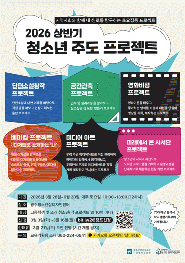 [¹Ìµð¾îÀü³² Á¦°¥´ëÁ¾ ±âÀÚ]±¤Áֽñ³À°Ã»½Ã¹ÎÇùÄ¡ÁøÈï¿øÀÌ °íµîÇлý ¹× Çб³ ¹Û û¼Ò³âÀ» ´ë»óÀ¸·Î ¡®Ã»¼Ò³â ÁÖµµ ÇÁ·ÎÁ§Æ®¡¯ Âü°¡ÀÚ¸¦ ¸ðÁýÇÑ´Ù. ¡®Ã»¼Ò³â ÁÖµµ ÇÁ·ÎÁ§Æ®¡¯´Â ½Ã¹ÎÇùÄ¡ÁøÈï¿ø°ú ±¤ÁÖû¼Ò³â»îµðÀÚÀμ¾ÅͰ¡ û¼Ò³âµéÀÌ ÇС¦