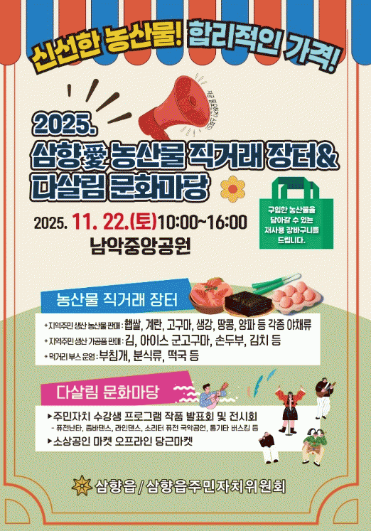 [¹Ìµð¾îÀü³² ±èÆÇ±¹ ±âÀÚ]¹«¾È±º »ïÇâÀ¾°ú »ïÇâÀ¾ÁÖ¹ÎÀÚÄ¡À§¿øÈ¸°¡ ÁÖ°üÇϴ¡º2025³â »ïÇâäñ Á÷°Å·¡ ÀåÅÍ With ´Ù»ì¸² ¹®È¸¶´ç¡»ÀÌ ¿À´Â 11¿ù 22ÀÏ ³²¾ÇÁß¾Ó°ø¿ø ÀÏ¿ø¿¡¼ ¿¸°´Ù. À̹ø Çà»ç´Â Áö¿ª¿¡¼ »ý»êÇÑ ³ó»ê¹°À» ³ó°¡¿¡¼ Á÷Á¢¡¦