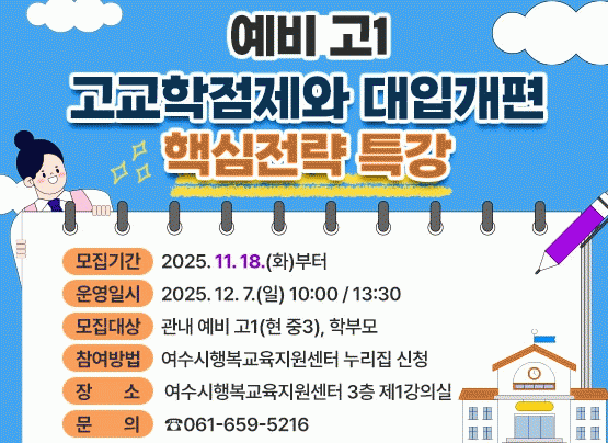 [¹Ìµð¾îÀü³² ÀüÇü¼º ±âÀÚ]¿©¼ö½Ã´Â °ü³» ¿¹ºñ °íµîÇб³ 1Çгâ(ÇöÀç ÁßÇб³ 3Çгâ)°ú Çкθ𸦠´ë»óÀ¸·Î ¡®°í±³ÇÐÁ¡Á¦¿Í ´ëÀÔ °³Æí ÇÙ½É Àü·« Ư°¡¯À» ¿î¿µÇÑ´Ù. À̹ø Ư°Àº ¿À´Â 12¿ù 7ÀÏ ¿ÀÀü 10½Ã, ¿ÀÈÄ 1½Ã 30ºÐ µÎ Â÷·Ê¿¡ °ÉÃÄ ¿©¡¦