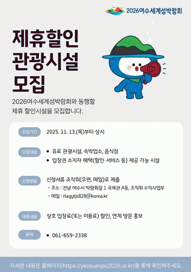 [¹Ìµð¾îÀü³² ÀüÇü¼º ±âÀÚ](Àç)2026¿©¼ö¼¼°è¼¶¹Ú¶÷ȸÁ¶Á÷À§¿øÈ¸´Â ¿ÃÇØ 11¿ùºÎÅÍ ÀÔÀå±Ç Á¦ÈÞ ÇÒÀÎó¸¦ »ó½Ã ¸ðÁýÇÑ´Ù°í ¹àÇû´Ù. ¼¶¹Ú¶÷ȸ ¿¬°è °¡´É ±Ç¿ªÀÇ °ü±¤½Ã¼³ µî°ú Á¦ÈÞ¸¦ ¸Î¾î »óÈ£ ÀÔÀå·á(¶Ç´Â ÀÌ¿ë·á) ÇÒÀÎ ÇýÅÃÀ» Á¦°øÇϰí,¡¦