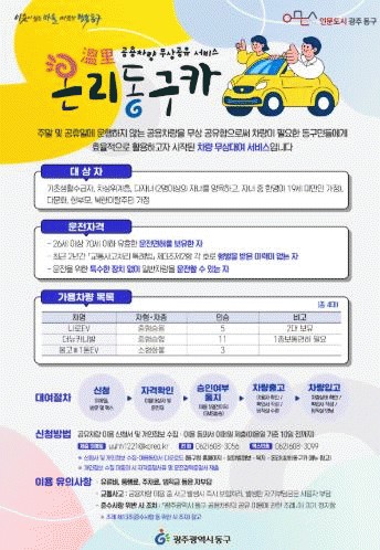 [¹Ìµð¾îÀü³² Á¦°¥´ëÁ¾ ±âÀÚ]±¤ÁÖ µ¿±¸´Â ÁÖ¸»°ú °øÈÞÀÏ¿¡ ¿îÇàÇÏÁö ¾Ê´Â °ü°ø¼ °ø¿ëÂ÷·®À» ¹«»ó ´ë¿©ÇÏ´Â ¡®¿Â¸®(è®×ì) µ¿±¸Ä«¡¯ °øÀ¯ ¼ºñ½º¸¦ ½ÃÇàÇÑ´Ù°í ¹àÇû´Ù. ¿Â¸®(è®×ì) µ¿±¸Ä« °øÀ¯ ¼ºñ½º´Â °ü³» »çȸÀû ¹è·Á ´ë»óÀÚ(±âÃÊ»ýȰ¡¦
