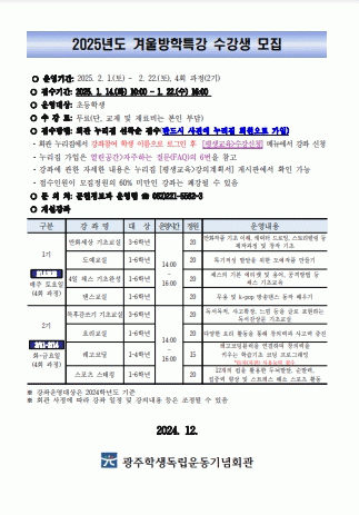 [¹Ìµð¾îÀü³² Á¦°¥´ëÁ¾ ±âÀÚ]±¤ÁÖÇлýµ¶¸³¿îµ¿±â³äȸ°üÀº °Ü¿ï¹æÇÐÀ» ¸Â¾Æ ¡®°Ü¿ï¹æÇÐÆ¯°¡¯ ¼ö°»ýÀ» ¼±Âø¼ø ¸ðÁýÇÑ´Ù. ¡®°Ü¿ï¹æÇÐÆ¯°¡¯Àº ÃʵîÇлýµéÀÇ °ÇÀüÇϰí À¯ÀÍÇÑ ¹æÇÐ »ýȰÀ» Áö¿øÇϰí, Ư±âÀû¼º °è¹ß Áö¿øÀ» À§ÇØ ¸¶·ÃµÆ´Ù. ¡¦