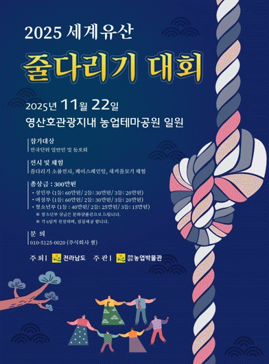 [¹Ìµð¾îÀü³² Á¦°¥´ëÁ¾ ±âÀÚ]Àü¶ó³²µµ³ó¾÷¹Ú¹°°üÀÌ À¯³×½ºÄÚ ¼¼°è¹«ÇüÀ¯»ê¿¡ µîÀçµÈ Áٴٸ®±â ¹®È¸¦ ±â¸®°í, ±× ÀüÅëÀÇ °¡Ä¡¸¦ ³Î¸® ¾Ë¸®±â À§ÇØ ¿À´Â 21Àϰú 22ÀÏ ¡®¼¼°èÀ¯»ê Áٴٸ®±â ´ëȸ¡¯¿Í ÇмúÆ÷·³À» °³ÃÖÇÑ´Ù. ¿ÃÇØ óÀ½À¸·Î Ãß¡¦
