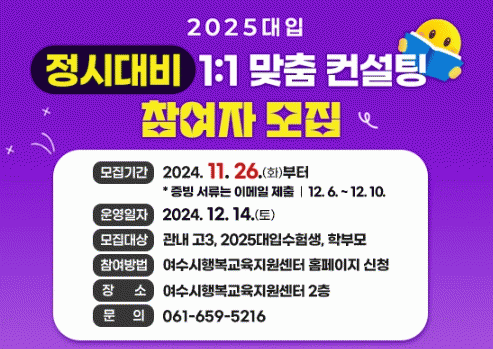 [¹Ìµð¾îÀü³² ÀüÇü¼º ±âÀÚ]¿©¼ö½Ã°¡ °íµîÇб³ 3Çгâ Çлý ¹× N¼ö»ý(´ëÀÔ¿¡ 2¹ø ÀÌ»ó µµÀüÇÏ´Â ¼öÇè»ý) µî 2025 ´ëÀÔ ¼öÇè»ýÀ» ´ë»óÀ¸·Î ¡®Á¤½ÃÀüÇü ´ëºñ 1:1 ¸ÂÃã ÄÁ¼³ÆÃ¡¯À» Âü¿©ÀÚ¸¦ ¸ðÁýÇÑ´Ù. ¸ðÁýÀοøÀº 60¿© ¸íÀ¸·Î, Âü¿©¸¦ Èñ¸ÁÇϴ¡¦