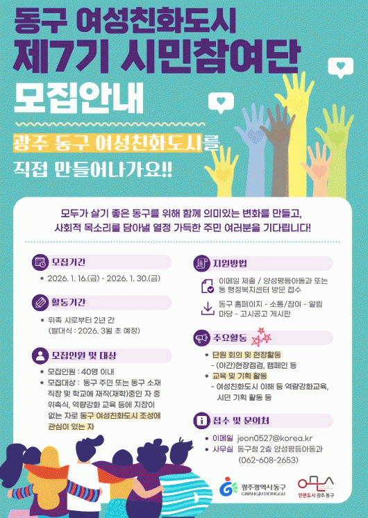 [¹Ìµð¾îÀü³² Á¦°¥´ëÁ¾ ±âÀÚ]±¤ÁÖ µ¿±¸´Â ÁÖ¹ÎÀÌ Á÷Á¢ Âü¿©ÇØ ¿©¼ºÄ£Èµµ½Ã Á¤Ã¥À» ¸¸µé¾î°¡´Â ¡®Á¦7±â µ¿±¸ ¿©¼ºÄ£Èµµ½Ã ½Ã¹ÎÂü¿©´Ü¡¯À» ÀÌ´Þ 30ÀϱîÁö ¸ðÁýÇÑ´Ù°í ¹àÇû´Ù. ¿©¼ºÄ£Èµµ½Ã ½Ã¹ÎÂü¿©´ÜÀº ÇàÁ¤ ÁÖµµ°¡ ¾Æ´Ñ ÁֹΠÂü¿© Á߽ɡ¦