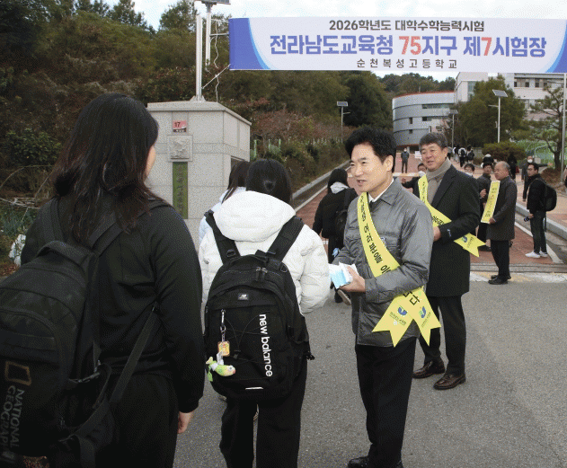 [¹Ìµð¾îÀü³² °í±Ô¼® ±âÀÚ]Àü¶ó³²µµ±³À°Ã»ÀÌ 2026Çг⵵ ´ëÇмöÇдɷ½ÃÇèÀÏÀÎ 13ÀÏ ½ÃÇèÀåÀ» ã¾Æ ¼öÇè»ýÀ» ÀÀ¿øÇß´Ù. ±è´ëÁß ±³À°°¨À» ºñ·ÔÇÑ µµ±³À°Ã» °£ºÎµéÀº À̳¯ ¿ÀÀü 75Áö±¸ Á¦7½ÃÇèÀåÀÎ ¼øÃµº¹¼º°íµîÇб³ ±³¹® ¾Õ¿¡¼ ½ÃÇèÀ» ¡¦