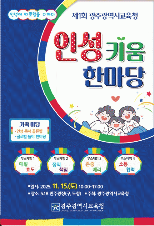 [¹Ìµð¾îÀü³² Á¦°¥´ëÁ¾ ±âÀÚ]±¤Áֽñ³À°Ã»°ú Çб³, °¡Á¤, Áö¿ª»çȸ°¡ ±¤ÁÖ ÇлýÀÇ ¹Ù¸¥ ÀμºÀ» Ű¿ì±â À§ÇÑ ¼ÒÅëÀÇ ÀåÀ» ¿î¿µÇÑ´Ù. ½Ã±³À°Ã»Àº ¿À´Â 15ÀÏ 5¡¤18¹ÎÁÖ±¤Àå¿¡¼ ¡®Á¦1ȸ Àμº Ű¿ò ÇѸ¶´ç¡¯ Çà»ç¸¦ °³ÃÖÇÑ´Ù. ¡®Àμº Ű¿ò ¡¦