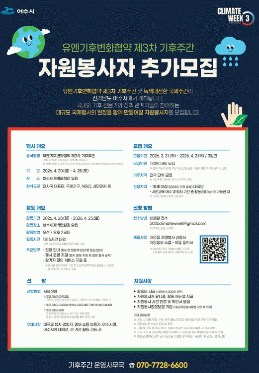 [¹Ìµð¾îÀü³² ÀüÇü¼º ±âÀÚ] ¿©¼ö½Ã´Â ¿À´Â 4¿ù °³ÃֵǴ ¡®À¯¿£±âÈĺ¯ÈÇù¾à Á¦3Â÷ ±âÈÄÁÖ°£(UN Climate Change Week 3)¡¯°ú ¡®³ì»ö´ëÀüȯ(GX) ±¹Á¦ÁÖ°£¡¯ÀÇ ¿øÈ°ÇÑ ¿î¿µÀ» À§ÇØ ÀÚ¿øºÀ»çÀÚ¸¦ Ãß°¡ ¸ðÁýÇÑ´Ù°í ¹àÇû´Ù. À̹ø Çà»ç´Â 198°³¡¦