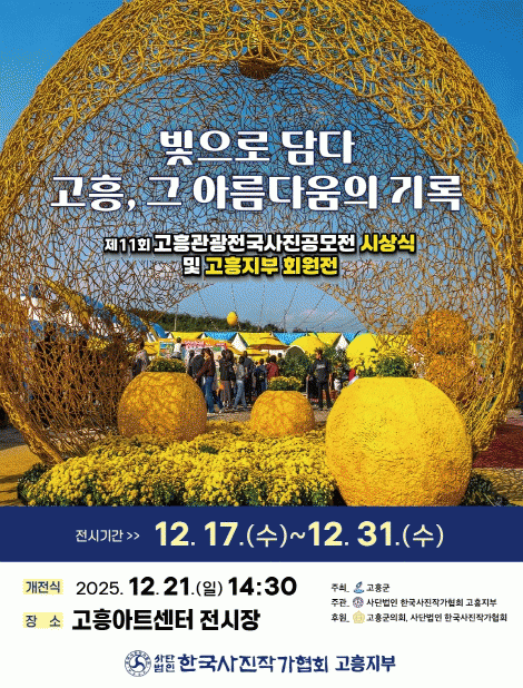 [¹Ìµð¾îÀü³² Á¦°¥´ëÁ¾ ±âÀÚ]°íÈﱺÀº ¿À´Â 12¿ù 17ÀϺÎÅÍ 31ÀϱîÁö °íÈï¾ÆÆ®¼¾ÅÍ¿¡¼ Á¦11ȸ °íÈï°ü±¤ Àü±¹ »çÁø°ø¸ðÀü Àü½Ãȸ¸¦ °³ÃÖÇÑ´Ù°í ¹àÇû´Ù. À̹ø Àü½Ã´Â °íÈï¾ÆÆ®¼¾ÅÍ 1Ãþ Àü½Ã½Ç¿¡¼ ¿¸®¸ç, ¹Ú¸¸¼® (»ç)Çѱ¹»çÁøÀÛ°¡Çùȸ °íÈ