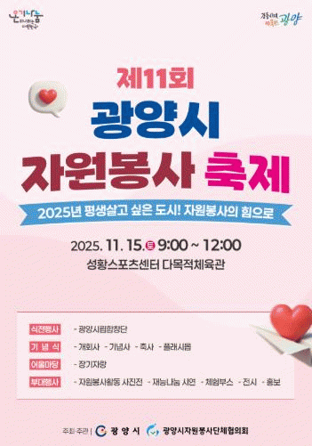[¹Ìµð¾îÀü³² ÀÓ¼º¿Ï ±âÀÚ]±¤¾ç½Ã´Â ¿À´Â 11¿ù 15ÀÏ ¼ºÈ²½ºÆ÷Ã÷¼¾ÅÍ ´Ù¸ñÀûüÀ°°ü¿¡¼ ±¤¾ç½ÃÀÚ¿øºÀ»ç´ÜüÇùÀÇȸ ÁÖ°üÀ¸·Î ¡®Á¦11ȸ ±¤¾ç½Ã ÀÚ¿øºÀ»ç ÃàÁ¦¡¯¸¦ °³ÃÖÇÑ´Ù°í ¹àÇû´Ù. ¡®±¤¾ç½Ã ÀÚ¿øºÀ»ç ÃàÁ¦¡¯´Â ÇÑ ÇØ µ¿¾È Áö¿ª»çȸ ¹ßÀüÀ»¡¦