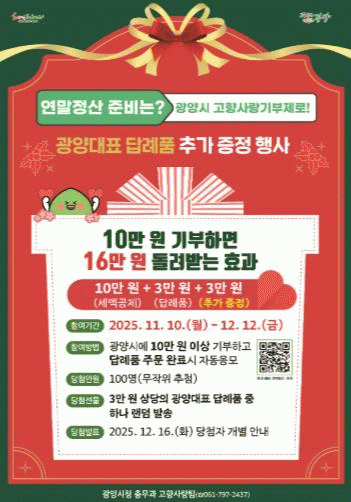 [¹Ìµð¾îÀü³² ÀÓ¼º¿Ï ±âÀÚ]±¤¾ç½Ã°¡ ¿¬¸»Á¤»ê ½Ã±â¸¦ ¸Â¾Æ ¿À´Â 11¿ù 10ÀϺÎÅÍ 12¿ù 12ÀϱîÁö °íÇâ»ç¶û±âºÎÁ¦¿¡ Âü¿©ÇÑ ±âºÎÀÚ¸¦ ´ë»óÀ¸·Î ±¤¾ç ´ëÇ¥ ´ä·ÊǰÀ» Ãß°¡ ÁõÁ¤ÇÏ´Â Çà»ç¸¦ ÁøÇàÇÑ´Ù. ±¤¾ç½Ã¿¡ 10¸¸ ¿ø ÀÌ»ó ±âºÎÇÏ°í ´ä·Êǰ ½Å¡¦