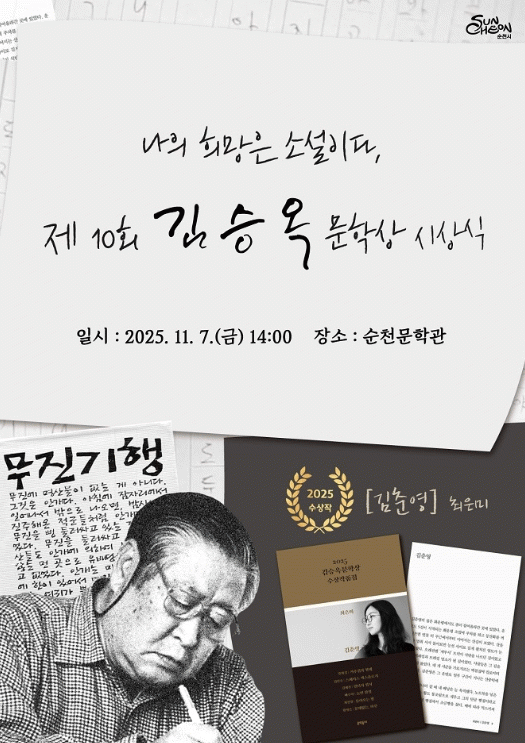 [¹Ìµð¾îÀü³² ÀÓ¼º¿Ï ±âÀÚ]¼øÃµ½Ã´Â ¿À´Â 7ÀÏ ¿ÀÈÄ 2½Ã, ¼øÃµ¹®Çаü ÀÏ¿ø¿¡¼ ¡®Á¦10ȸ ±è½Â¿Á¹®Çлó ½Ã»ó½Ä¡¯À» °³ÃÖÇÑ´Ù°í ¹àÇû´Ù. Çѱ¹ Çö´ë¹®ÇÐÀ» ´ëÇ¥ÇÏ´Â ÀÛ°¡ ±è½Â¿ÁÀÇ À̸§À» µý ±è½Â¿Á¹®ÇлóÀº 2013³â Á¦Á¤µÇ¾î, ½Ã´ëÀÇ °¨¼ö¼ºÀ»¡¦