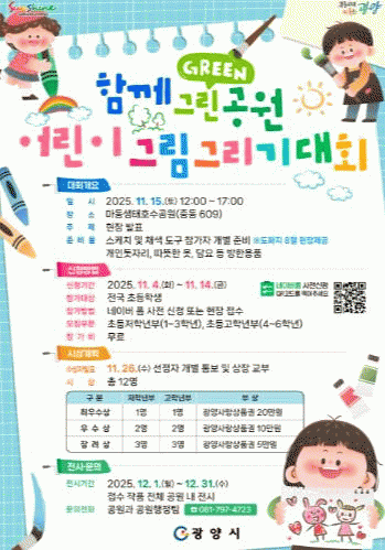[¹Ìµð¾îÀü³² ÀÓ¼º¿Ï ±âÀÚ]±¤¾ç½Ã´Â ¿À´Â 11¿ù 15ÀÏ ¿ÀÈÄ 12½ÃºÎÅÍ 5½Ã±îÁö ¸¶µ¿»ýÅÂÈ£¼ö°ø¿ø¿¡¼ ¡®2025 ±¤¾ç½Ã 'ÇÔ²² Green °ø¿ø' ¾î¸°ÀÌ ±×¸²±×¸®±â ´ëȸ¡¯¸¦ °³ÃÖÇÑ´Ù°í ¹àÇû´Ù. À̹ø ´ëȸ´Â ¾î¸°À̵éÀÌ °ø¿ø¿¡¼ ÀÚ¿¬°ú ¾î¿ï¸®¸ç °ø¡¦