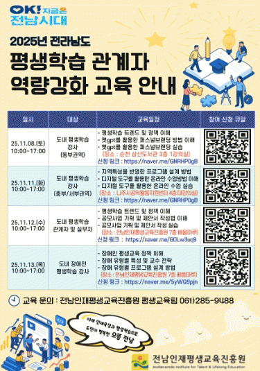 [¹Ìµð¾îÀü³² Á¦°¥´ëÁ¾ ±âÀÚ]Àü³²ÀÎÀçÆò»ý±³À°ÁøÈï¿øÀº Æò»ýÇнÀ °ü°èÀÚÀÇ Àü¹®¼º°ú ÇöÀå ´ëÀÀ ¿ª·®À» °ÈÇϱâ À§ÇØ 2025 Àü³²µµ Æò»ýÇнÀ °ü°èÀÚ ¿ª·®°È ±³À° Âü°¡ÀÚ¸¦ ¿À´Â 7ÀϱîÁö ¸ðÁýÇÑ´Ù°í ¹àÇû´Ù. À̹ø ±³À°Àº Æò»ýÇнÀ °»ç, ¡¦