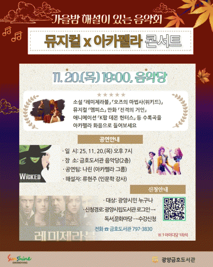 [¹Ìµð¾îÀü³² ÀÓ¼º¿Ï ±âÀÚ]±¤¾ç½Ã¸³µµ¼°üÀÌ ¿À´Â 11¿ù 20ÀÏ ¿ÀÈÄ 7½Ã, ±ÝÈ£µµ¼°ü À½¾Ç´ç¿¡¼ Ưº°ÇÑ À½¾Ç ÄܼƮ '°¡À»¹ã ÇØ¼³ÀÌ ÀÖ´Â À½¾Çȸ'¸¦ °³ÃÖÇÑ´Ù. À̹ø À½¾ÇȸÀÇ Á¦¸ñÀº ¡®¹ÂÁöÄ῾ÆÄ«Æç¶ó ÄܼƮ¡¯·Î, ±ÝÈ£µµ¼°üÀÌ »õ·Ó°Ô ¡¦