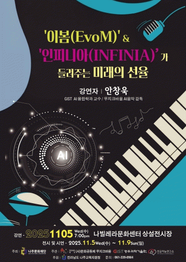 [¹Ìµð¾îÀü³² Á¦°¥´ëÁ¾ ±âÀÚ]³ªÁÖ¹®ÈÀç´ÜÀÌ ÀΰøÁö´É(AI)À» Ȱ¿ëÇÑ ½Å°³³ä À½¾Ç ÇÁ·ÎÁ§Æ® ¡®À̺½(EvoM)¡¤ÀÎÇǴϾÆ(INFINIA)°¡ µé·ÁÁÖ´Â ¹Ì·¡ÀÇ ¼±À²¡¯À» ¿À´Â 11¿ù 5ÀÏ Àú³á 7½Ã¿¡ ³ªºô·¹¶ó¹®È¼¾ÅÍ¿¡¼ °³ÃÖÇÑ´Ù. 31ÀÏ ³ªÁÖ¹®ÈÀç´Ü(ÀÌ¡¦