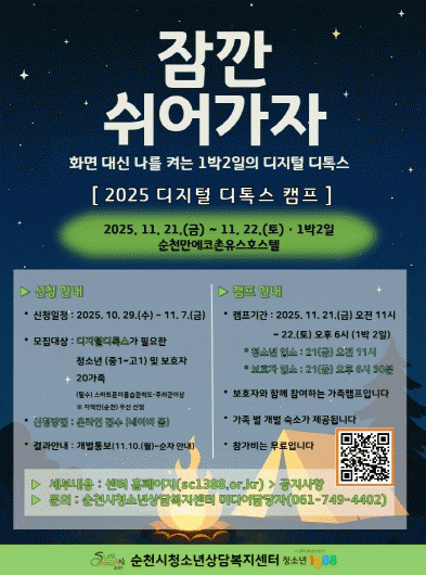 [¹Ìµð¾îÀü³² ÀÓ¼º¿Ï ±âÀÚ]¼øÃµ½Ã´Â û¼Ò³âÀÇ °Ç°ÇÑ ¹Ìµð¾î »ç¿ë½À°ü Çü¼º°ú °¡Á· °£ À¯´ë°¨ °È¸¦ À§ÇØ '2025³â û¼Ò³â µðÁöÅÐ µðÅ彺 Ä·ÇÁ'¸¦ ¿À´Â 11¿ù 21ÀϺÎÅÍ 22ÀϱîÁö ¼øÃµ¸¸¿¡ÄÚÃÌ À¯½ºÈ£½ºÅÚ¿¡¼ 1¹Ú 2ÀÏ °£ ¿î¿µÇÑ´Ù. À̹ø Ä·¡¦