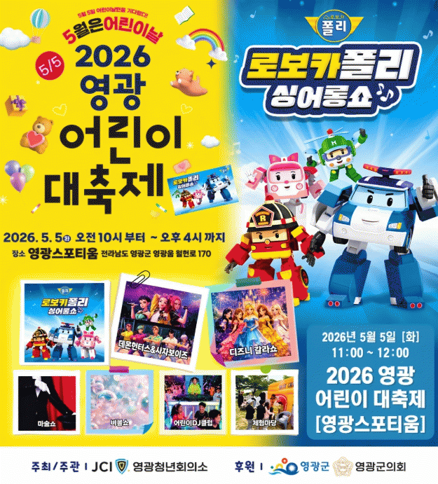 [¹Ìµð¾îÀü³² Á¦°¥´ëÁ¾ ±âÀÚ] ¿µ±¤Ã»³âȸÀǼÒ(JC)°¡ ÁÖÃÖ¡¤ÁÖ°üÇÏ°í ¿µ±¤±º¡¤¿µ±¤±ºÀÇȸ°¡ ÈÄ¿øÇÏ´Â ¡®2026³â ¾î¸°ÀÌ ´ëÃàÁ¦¡¯°¡ ¿À´Â 5¿ù 5ÀÏ 104ȸ ¾î¸°À̳¯À» ¸Â¾Æ ´ë´ëÀûÀ¸·Î °³ÃֵȴÙ. ¿ÃÇØ Çà»ç´Â ¿¹³âº¸´Ù ÇÑÃþ °ÈµÈ üÇè ÄÜÅÙ¡¦