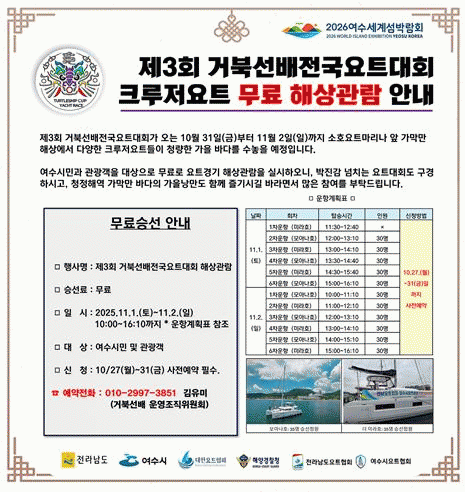 [¹Ìµð¾îÀü³² ÀüÇü¼º ±âÀÚ]¿©¼ö½Ã´Â ¿À´Â 10¿ù 31ÀϺÎÅÍ 11¿ù 2±îÁö 3Àϰ£ ¼ÒÈ£¿äÆ®¸¶¸®³ª ÀÏ¿ø¿¡¼ ¡®Á¦3ȸ °ÅºÏ¼±¹è Àü±¹¿äÆ®´ëȸ¡¯¸¦ °³ÃÖÇÑ´Ù. À̹ø ´ëȸ´Â 2026¿©¼ö¼¼°è¼¶¹Ú¶÷ȸ ºÕ¾÷ Á¶¼º°ú ÇØ¾ç½ºÆ÷Ã÷ Àúº¯ È®´ë¸¦ À§ÇØ ¸¶·ÃµÆ´Ù¡¦