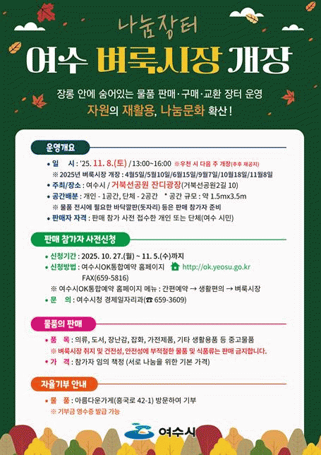 [¹Ìµð¾îÀü³² ÀüÇü¼º ±âÀÚ]¿©¼ö½Ã´Â ¿À´Â 11¿ù 8ÀÏ ¿ÀÈÄ 1½ÃºÎÅÍ 4½Ã±îÁö °ÅºÏ¼±°ø¿ø Àܵð±¤Àå¿¡¼ ¿ÃÇØ ¸¶Áö¸· ¡®Á¦6ȸ ¿©¼öº·è½ÃÀ塯À» °³ÃÖÇÑ´Ù. º·è½ÃÀåÀº ½Ã¹Î ´©±¸³ª Âü¿©ÇÒ ¼ö ÀÖ´Â ³ª´®ÀÇ ÀåÀ¸·Î Áß°í ÀÇ·ù, µµ¼, Àå³°¨, ÀâÈ¡¦