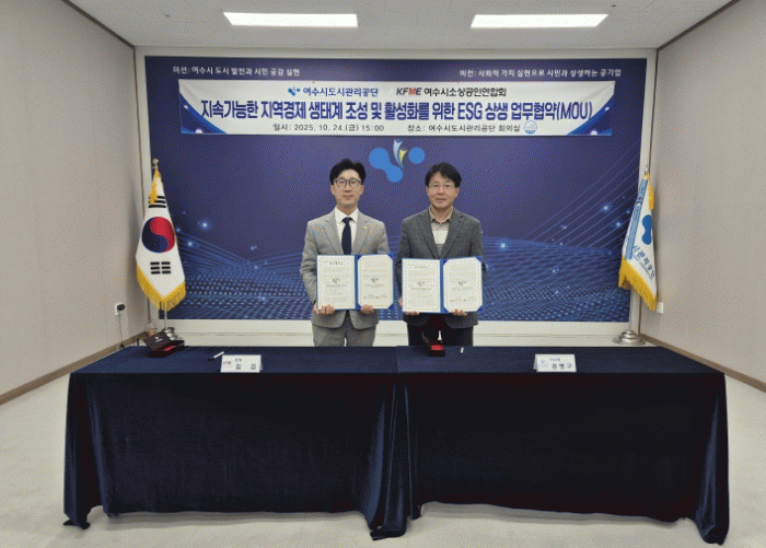 [¹Ìµð¾îÀü³² ÀüÇü¼º ±âÀÚ]¿©¼ö½Ãµµ½Ã°ü¸®°ø´Ü(ÀÌ»çÀå ¼Ûº´±¸)°ú ¿©¼ö½Ã ¼Ò»ó°øÀÎ ¿¬ÇÕȸ(ȸÀå ±è°â)´Â 2025³â 10¿ù 24ÀÏ, Áö¿ª°æÁ¦ ȸº¹°ú ESG(ȯ°æ¡¤»çȸ¡¤Áö¹è±¸Á¶) ±â¹Ý °ø±Þ¸Á ±¸ÃàÀ» À§ÇÑ ¾÷¹«Çù¾àÀ» ü°áÇß´Ù°í ¹àÇû´Ù. ÃÖ±Ù °æ±â¡¦