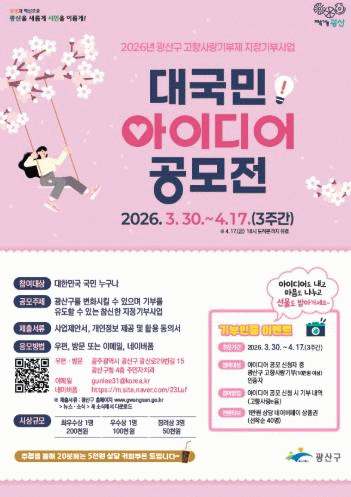 [¹Ìµð¾îÀü³² Á¦°¥´ëÁ¾ ±âÀÚ]±¤ÁÖ ±¤»ê±¸°¡ ¡®2026³â ±¤»ê±¸ °íÇâ»ç¶û±âºÎÁ¦ ÁöÁ¤±âºÎ»ç¾÷ ´ë±¹¹Î ¾ÆÀ̵ð¾î °ø¸ð¡¯¸¦ ¿À´Â 4¿ù 17ÀϱîÁö ÁøÇàÇÑ´Ù. Áö³ 2024³âºÎÅÍ ½ÃÇàµÈ °íÇâ»ç¶ûÁöÁ¤±âºÎÁ¦µµ´Â ÀÚÄ¡´ÜüÀÇ »ç¾÷ Áß ±âºÎ±ÝÀÌ »ç¿ëµÇ±æ¡¦