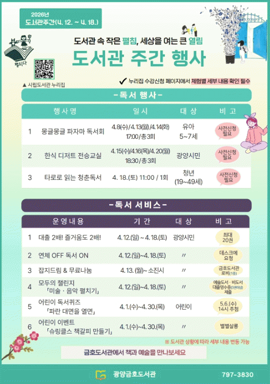 [¹Ìµð¾îÀü³² ÀÓ¼º¿Ï ±âÀÚ] ±¤¾ç±ÝÈ£µµ¼°üÀÌ 4¿ù µµ¼°üÁÖ°£À» ¸Â¾Æ ½Ã¹ÎÀÌ Ã¥°ú ¿¹¼úÀ» ÇÔ²² Áñ±æ ¼ö ÀÖµµ·Ï ´Ù¾çÇÑ Æ¯º° ÇÁ·Î±×·¥À» ¿î¿µÇÑ´Ù. À̹ø Çà»ç´Â ÀüÅë ½Ä¹®È¸¦ üÇèÇÏ´Â ¡®ÇÑ½Ä µðÀúÆ® Àü½Â±³½Ç¡¯°ú Ã¥°ú Ÿ·Î¸¦ ¸Å°³·Î °í¡¦