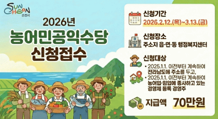 [¹Ìµð¾îÀü³² ÀÓ¼º¿Ï ±âÀÚ]¼øÃµ½Ã°¡ ¿ÃÇØºÎÅÍ ¡®³ó¾î¹Î °øÀͼö´ç¡¯À» ±âÁ¸ 60¸¸ ¿ø¿¡¼ 70¸¸ ¿øÀ¸·Î ÀλóÇØ Áö¿øÇÑ´Ù°í ¹àÇû´Ù. ³ó¾î¹Î °øÀͼö´çÀº ³ó¾î¾÷¡¤ÀÓ¾÷ÀÇ °øÀÍÀû °¡Ä¡¸¦ °ÈÇÏ°í ³ó¾î¹ÎÀÇ ¾ÈÁ¤ÀûÀÎ °æ¿µÀ» Áö¿øÇϱâ À§ÇØ ¼øÃµ½Ã¡¦