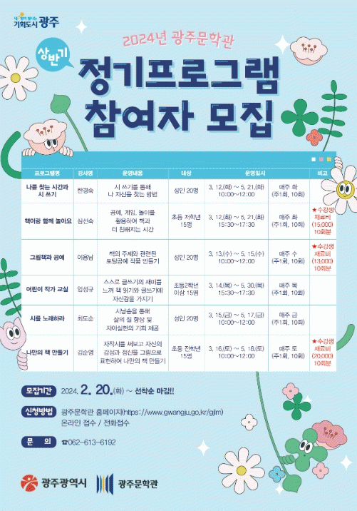 [¹Ìµð¾îÀü³² Á¦°¥´ëÁ¾ ±âÀÚ]±¤ÁÖ±¤¿ª½Ã¹®ÇаüÀÌ ¿À´Â 3¿ùºÎÅÍ ½ÃÀÛÇÏ´Â »ó¹Ý±â Á¤±â ÇÁ·Î±×·¥ ¼ö°»ýÀ» ¸ðÁýÇÑ´Ù. ÀÏ¹Ý ½Ã¹Î °Á´ ½Ã âÀÛ, ±×¸²Ã¥°ú °ø¿¹, ½Ã³¶¼Û ÇÁ·Î±×·¥ÀÌ ¿î¿µµÈ´Ù. ¡®½Ã âÀÛ¡¯ °Á´ ½Ã¸¦ ÁÁ¾ÆÇϰųª ½ÃÀÎÀÌ ¡¦