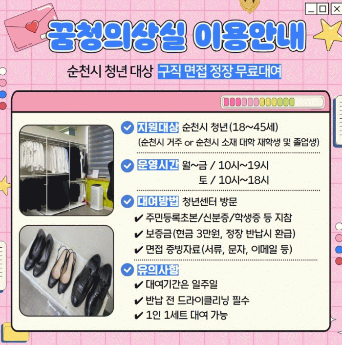[¹Ìµð¾îÀü³² ÀÓ¼º¿Ï ±âÀÚ]¼øÃµ½Ã´Â û³âµéÀÇ Ãë¾÷ Áغñ¸¦ À§ÇÑ °æÁ¦Àû ºÎ´ãÀ» ´ú¾îÁÖ°í ±¸Á÷ Ȱµ¿À» Áö¿øÇϱâ À§ÇØ ¸éÁ¢¿¡ ÇÊ¿äÇÑ Á¤Àå ¹× ¼Òǰ µîÀ» ¹«·á·Î ´ë¿©ÇØÁÖ´Â ²ÞûÀÇ»ó½ÇÀ» ¿î¿µÇÑ´Ù°í ¹àÇû´Ù. ¼øÃµ½Ãû³â¼¾ÅÍ ²ÞûÀÇ»ó½ÇÀº Ã롦