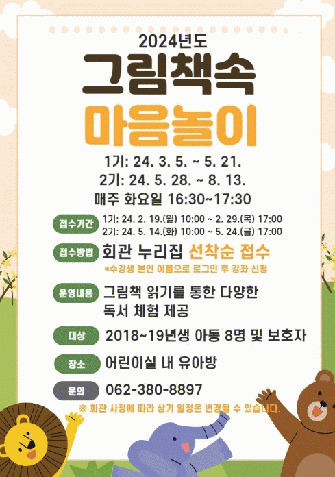 [¹Ìµð¾îÀü³² Á¦°¥´ëÁ¾ ±âÀÚ]±¤ÁÖÇлý±³À°¹®Èȸ°üÀÌ ¿À´Â 3¿ù 5ÀϺÎÅÍ 6¿ù 22ÀϱîÁö ¿î¿µµÇ´Â ¡®2024³âµµ »ó¹Ý±â µ¶¼ÇÁ·Î±×·¥¡¯ ¼ö°»ýÀ» ¸ðÁýÇÑ´Ù. 20ÀÏ ±¤ÁÖÇлý±³À°¹®Èȸ°ü¿¡ µû¸£¸é À̹ø °Á´ À¯¾Æ ¹× Çзɱ⠾Ƶ¿ÀÇ µ¶¼¸¦ ÅëÇÑ¡¦